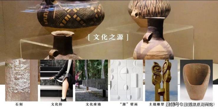 基于本案案名“中海-源境”,结合基地所处的周边新乐遗址与北陵公园,挖掘新乐遗址文化之源,从中提取出“碑刻、文化阶、文化座墙、源壁画、主题图腾雕塑、主题陶器雕塑”等文化元素,作为文化载体融入场地设计之中。