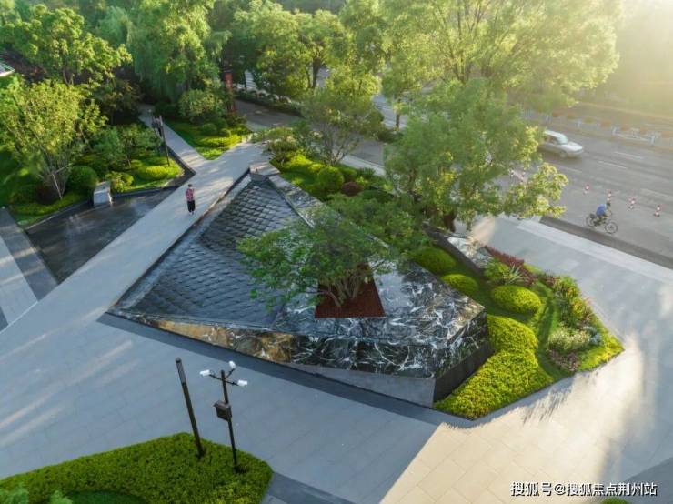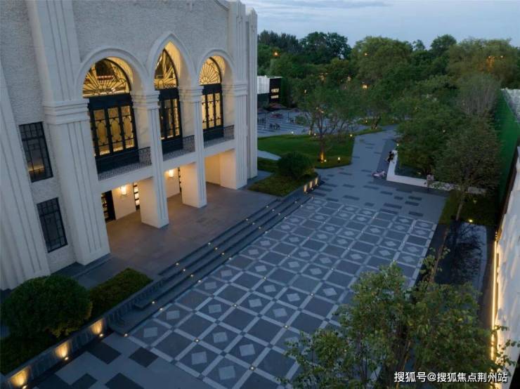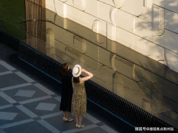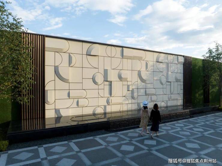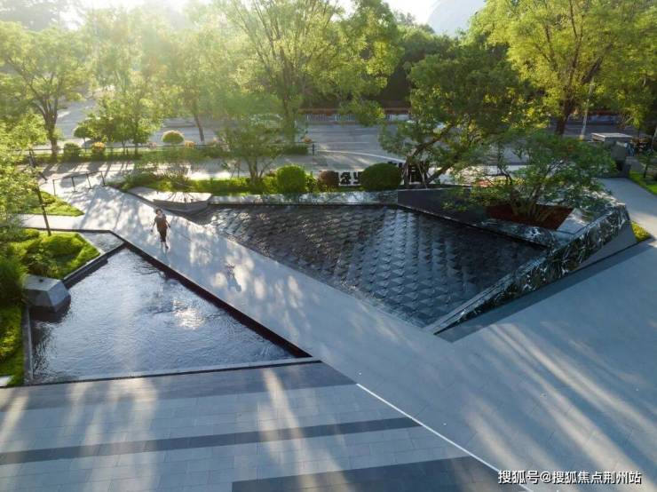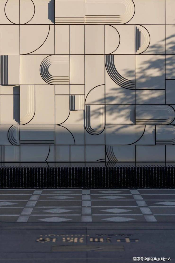 结合下方景观水景案台,通过跌水的动态连接,将源景墙上的遗址图腾与城市书屋售楼处前广场地面的特色铺装做一个文化衍生,仿佛是一幅古与今对话延续,来迎合古建筑的复古感。地面的菱形同时也是历史古建筑窗格上的纹样,菱形纹状还是原始选民捕鱼等网状,而网乃进财的象征,在中国的传统吉祥图案中,属于文人八宝之一,通常含有超越、丰收、进财等美好寓意。
