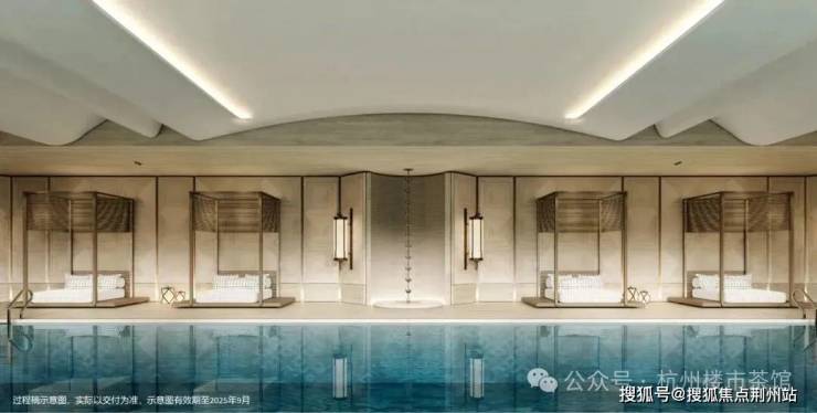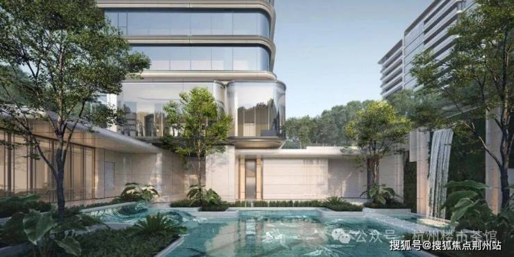 项目公区配备了下沉庭院、室内恒温泳池与嬉水池,双池可通过开合玻璃立面产生互动,还有中轴水景花园会所、空中观景健身盒子等。