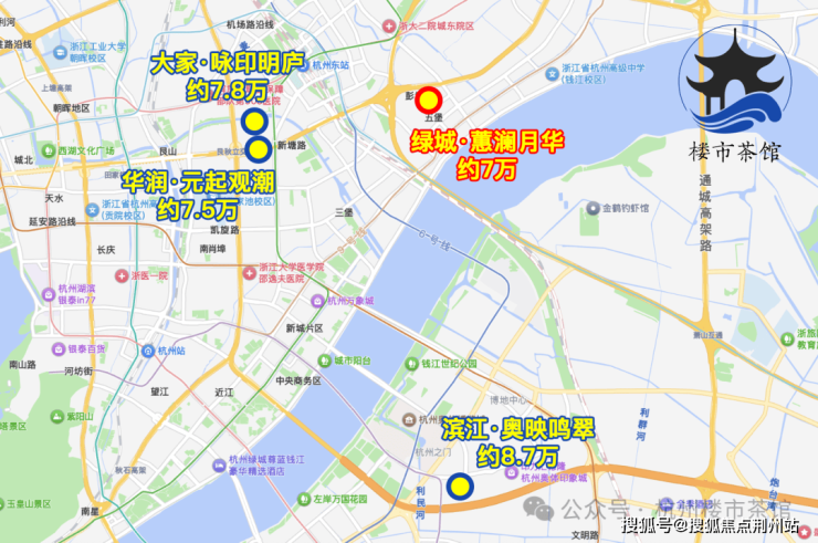 地块北侧临近钱塘快速路,南侧直线距离地铁9号线五堡站约800米,距离钱塘江约1公里,区位上属于江河汇聚、四通八达之地。另外,项目东邻刚刚交付不久的芝澜月华,南邻江华玺云,豪宅圈层十分纯粹。