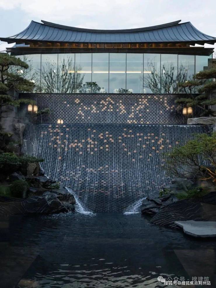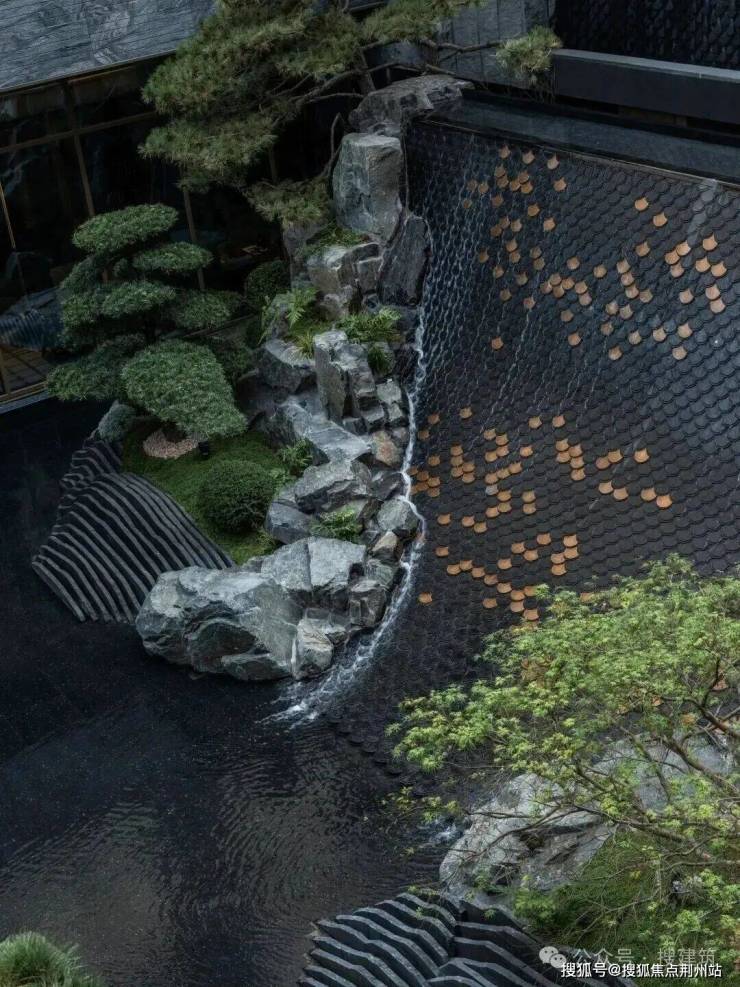 庭院中心超5米高的定制水幕如鎏金龙鳞倾泻而下,水声激越,波光流转,成为视觉与听觉的焦点,这里的每一块龙鳞纹均为手工铺设,细节精巧。