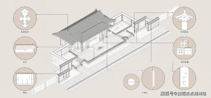 青墨建筑设计在材质选择上采用朱红色不锈钢和白金石材营造赤白的唐风氛围,由槅扇门演变而来的咖色格子窗施于殿堂门两侧各间的槛墙上,片墙做法原型取自杭州余杭径山寺的照壁,搭配在唐代角柱的基础上进行柔化的朱红。朱红缆柱,朱漆勾金,为恢弘的整体形构增添了细节的精致秀美。