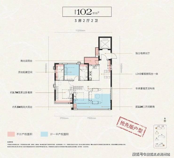 独立电梯光厅、南北双阳台、灵活拓展空间、约3.7米宽景主卧套房、约7.5米南向大阳台、LDKB餐客厨阳台一体、非承重墙灵活布局、超11米三开间朝南。