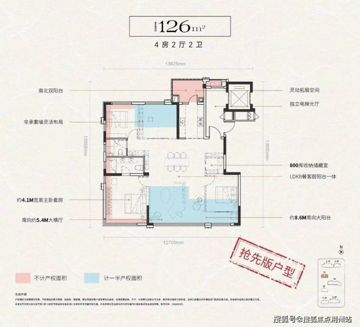 南北双阳台、灵活拓展空间、独立电梯前室、非承重墙灵活布局、800库收纳、约4.2米全景舱主卧套房、约8.8米南向大阳台、约5.5米南向大横厅。