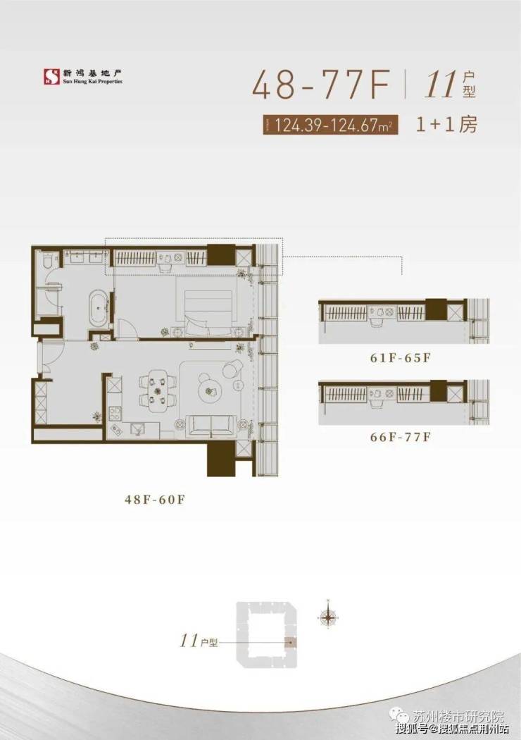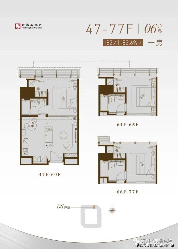 约60㎡,项目起步户型,一室,门槛低,景观视野不错,无湖景。