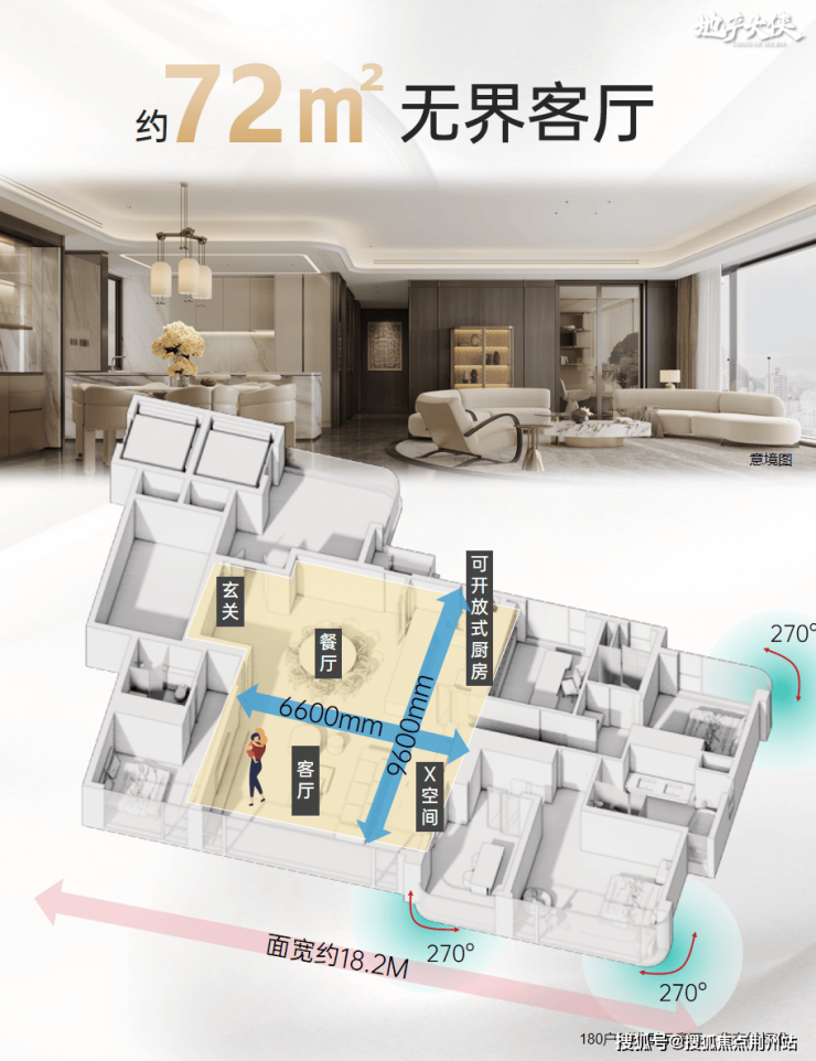 户型面宽约18.2m,超6面宽;约6.8m大方厅,+1功能自定义。