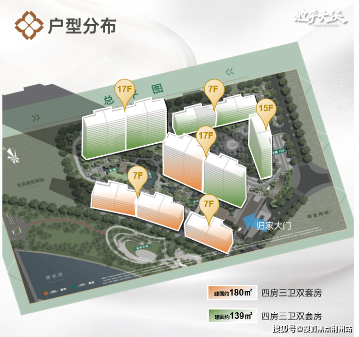 首先,前排洋房搭配后排小高,实现了最大化的面河景观(小高层约12F以上观河景)。