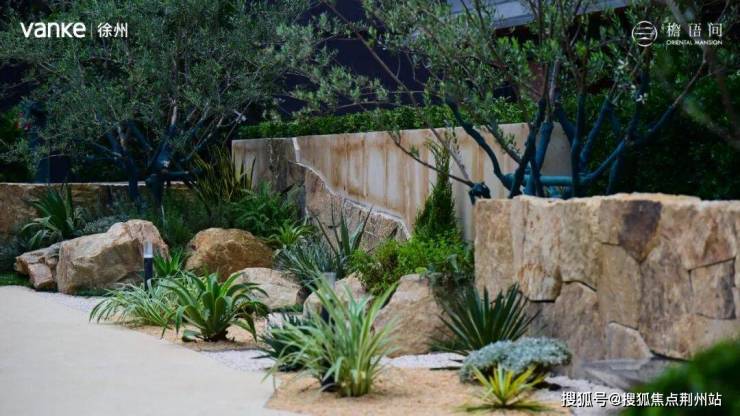 景墙与旁边由沙生植物打造的南法风格花园及点缀其间的天然景石相映成趣,自然气息扑面而来,实现“先入园,再归家”的沉浸式体验。