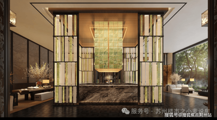 总长约88米、苏州首座大尺度流光造型宝顶及铂金长屏地标门厅;造价约150万、环岛中央非遗盆景