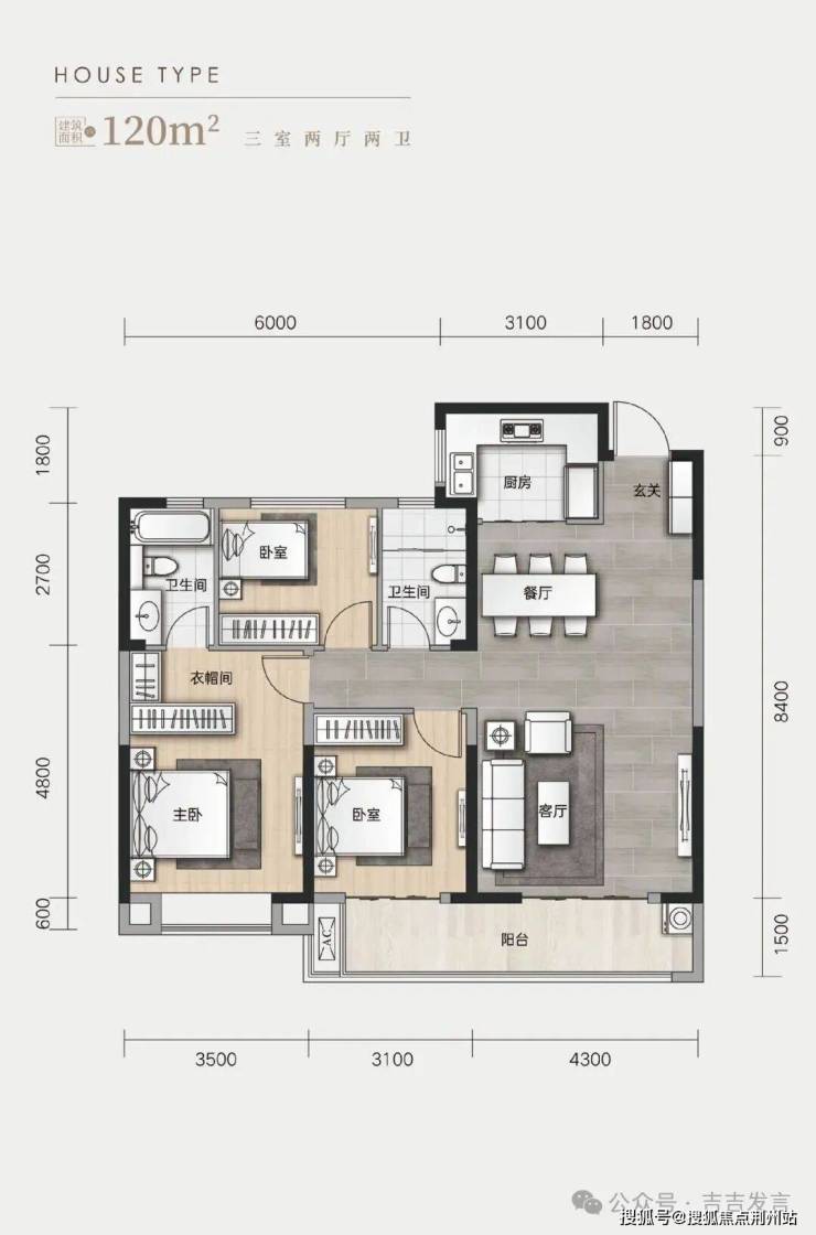 120㎡(3房2厅2卫)位于A2#中间户▽