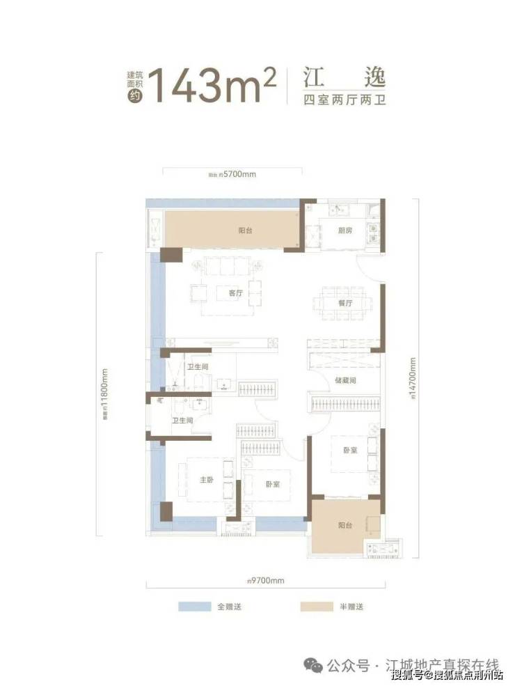 建面约143㎡户型,270°采光U型观江+高比例阳台赠送+“3+1”格局动静分区+约30㎡主卧套房。