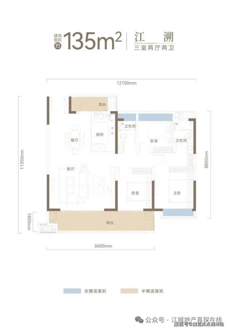 高比例阳台赠送,客厅、主卧、次卧、阳台全飘窗赠送,再加上一东一西两个超大阳台面积半赠送,超高比例赠送,全屋空间使用率达95%。