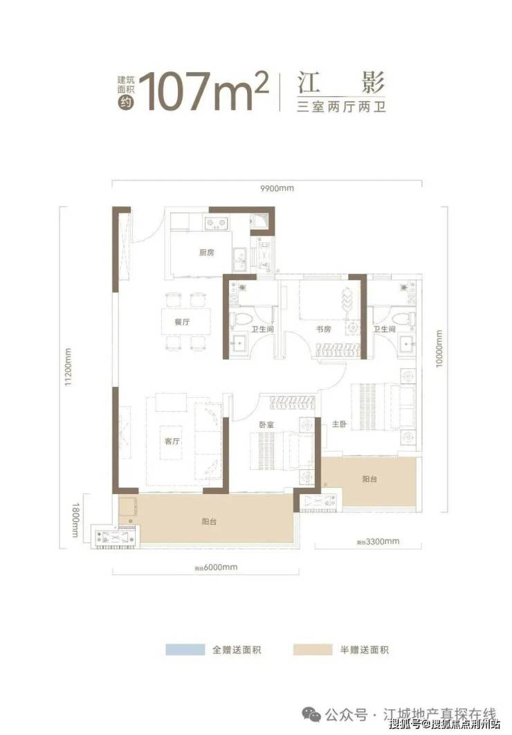 建面约107㎡户型,约10米南向观景阳台+约20㎡主卧套房+全明双卫。