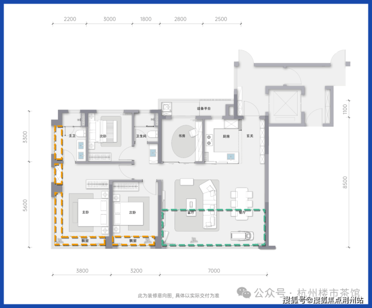 另外侧厅连同主卧做了连续飘窗,类似120方设计,视野朝向园区内部,面对中心九溪十八涧花园和青山湖花卉区,采光和观景条件极佳。