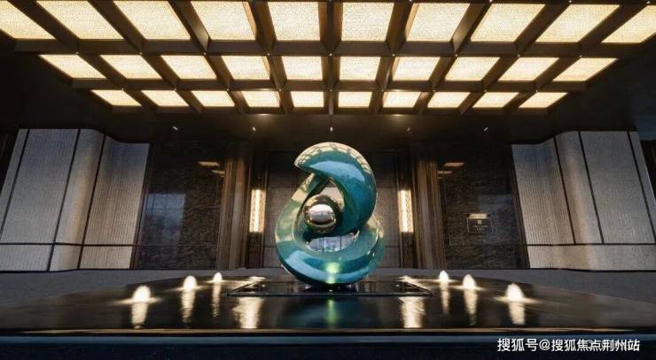 入口处整面运用巴西天然铂金钻奢石,铂金色彩如泉水般流淌,深邃璀璨,与礼序金属大门交相辉映。中心雕塑水景以安哥拉黑石材为基,托举“泉城明珠”艺术雕塑,寓意引泉踏水而归。