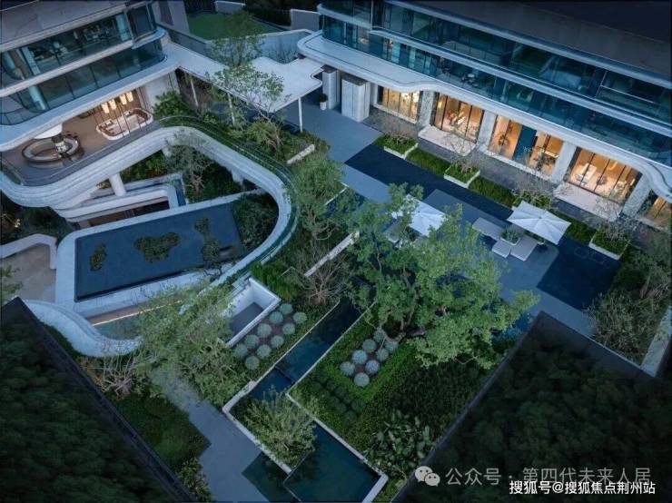 因项目整体抬高,从下沉庭院到架空层“空中花园”的落差极大,形成独特的峡谷地貌,杭序府的设计团队汲取九溪烟树为造园灵感,打造一个立体多维的城市溪谷交互园林;因项目毗邻江岸,杭序府的外立面以“站立的江潮”为灵感,大面积弧形玻璃与四层堆叠的石材线条,将钱塘江潮的千钧之力和流水之韵凝练于建筑肌理之中。