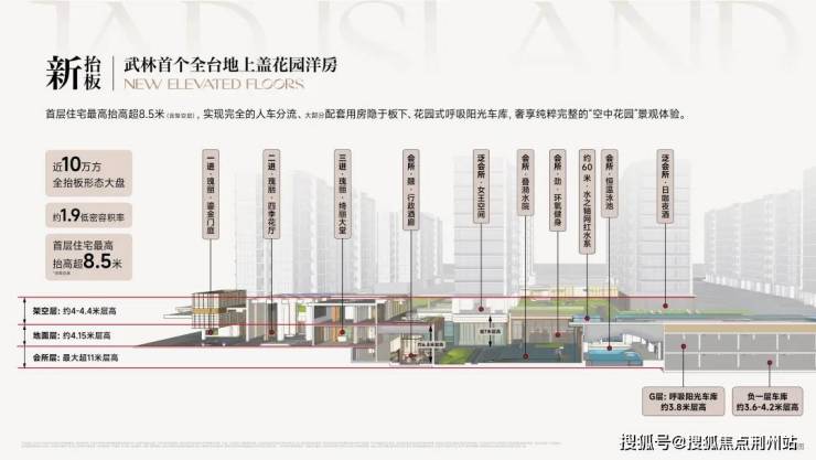 项目利用建筑新规创新设计「板块首个全台地上盖花园洋房」,整个小区通过约4.15米高的抬升,把“不利因素”隐藏起来,社区实现了彻底的人车分流。即便是洋房,2楼也相当于以往楼盘3-4楼高度,带来的是更优越的采光、通风,以及观景视野。