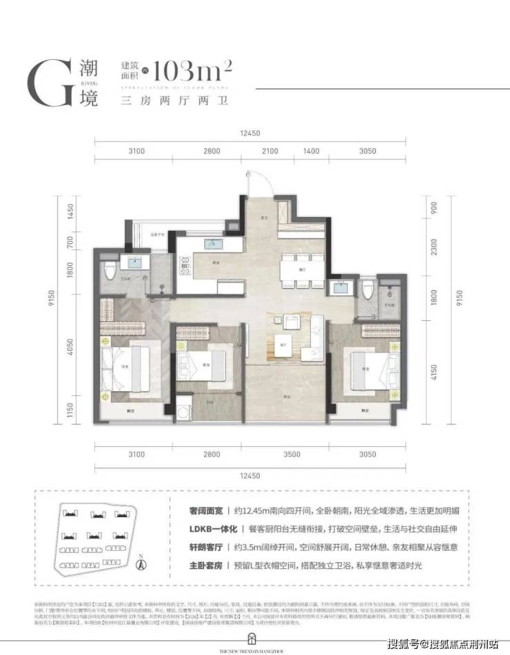 建面约103㎡的三房户型,四开间朝南,且南向面宽竟做到了约12.45米,阳光得以在全屋渗透。主卧预留的L型衣帽空间,让女主人一眼动心。