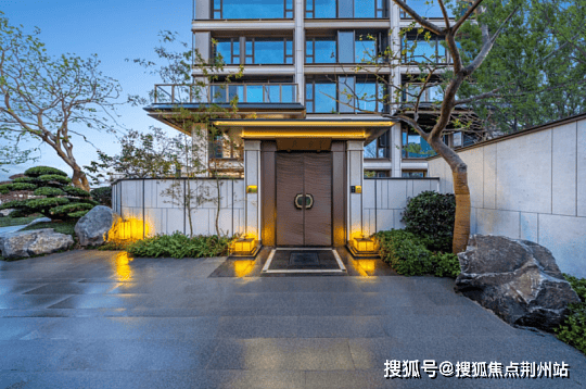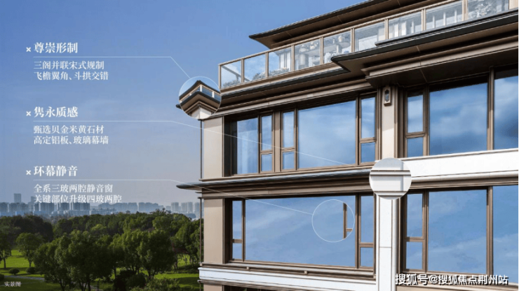 叠墅立面取形宋代楼阁规制,甄选贝金米黄石材、高定铝板与玻璃幕墙,全系三玻两腔静音窗,关键部门升级为四玻两腔,为世家呈现静谧奢境。