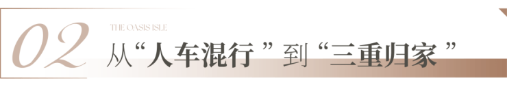 项目致力于将人车进行垂直分流,打造三重“阳光地下车库、中央车站、垂直交通”系统,在功能上实现车行、人行、非机动车动线分离,消除人车混行的安全隐患,同时结合地铁口归家入口打造双环岛交通组织,保障高峰时段进出从容有序,在仪制上与社区大堂、景观庭院共同构建三重归家仪式。