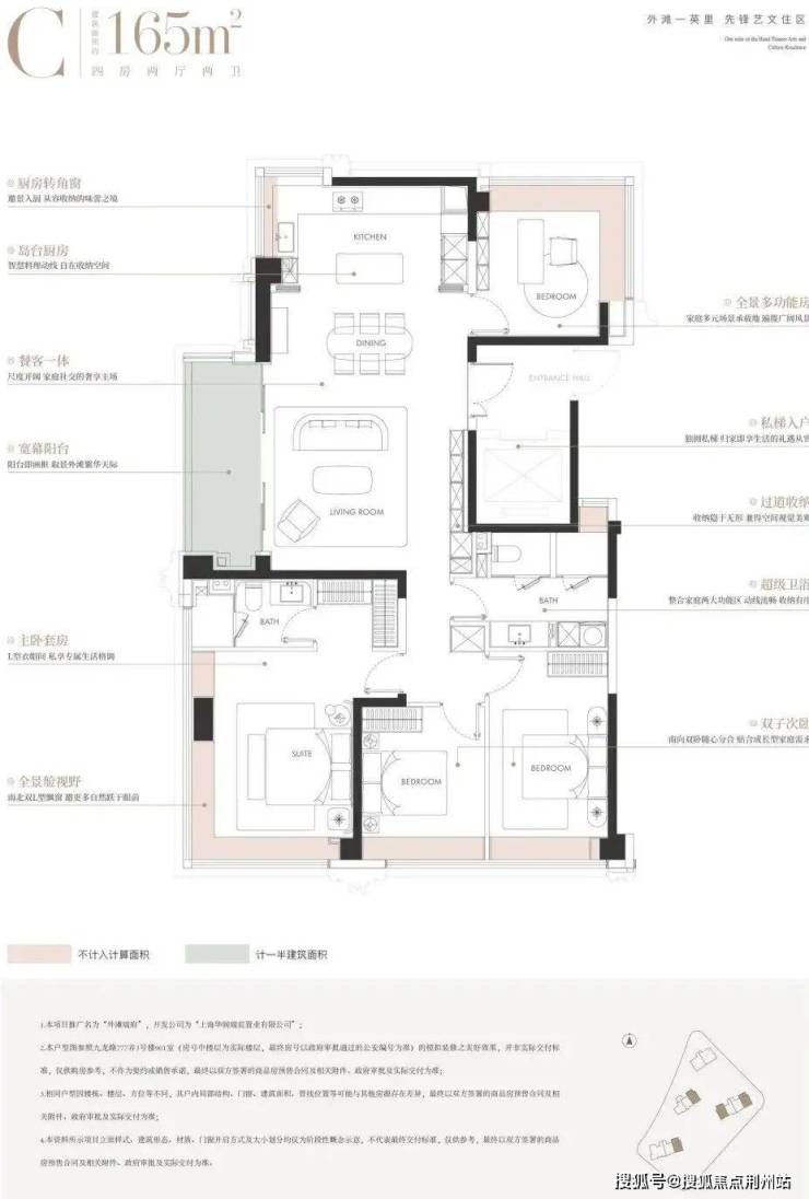 以建面约165平方米的户型为例,通过南北L型飘窗与无柱化设计的结合,实现了将陆家嘴摩天楼群与北外滩未来天际线同时纳入窗框的震撼效果。开放式的大横厅设计,进一步模糊了室内与室外的界限,让客厅成为一幅流动的城市画卷。