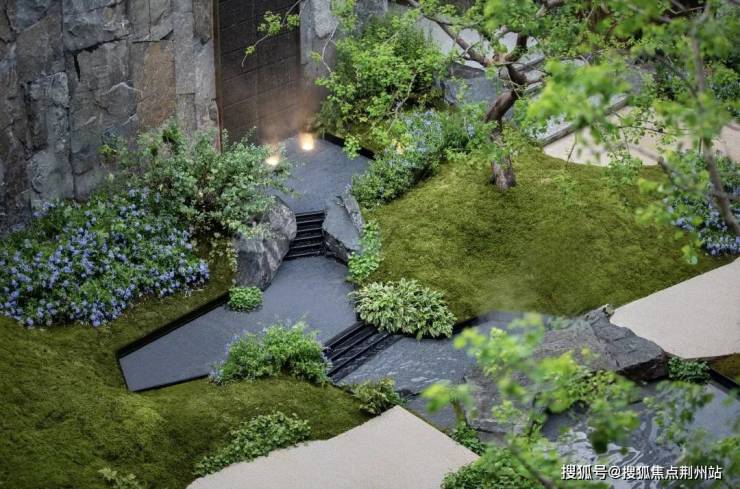里面点缀着特选黑松、羽毛枫、4棵乌桕等,以及采用约40吨自然石皮面打造的垂直立面墙,整个庭院犹如立体山水画卷,每一个角度都有不一样的风景。