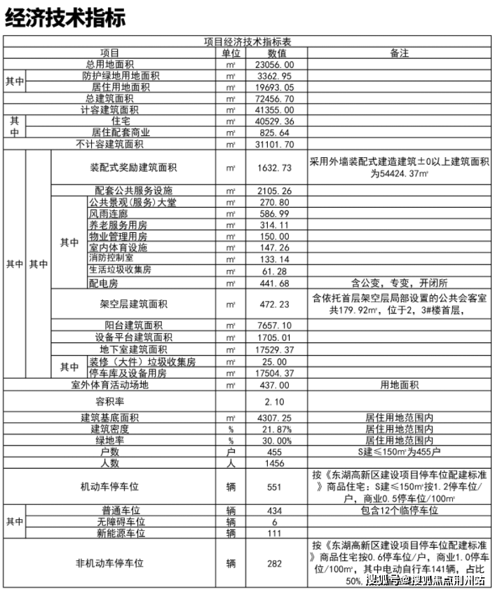 根据规划,项目的总建筑面积约72456.7㎡,计容建筑面积约41355㎡,住宅建筑面积约40529.36㎡,容积率2.1,总户数455户,户均89.07㎡,机动车位551个,车位比约1:1.21。