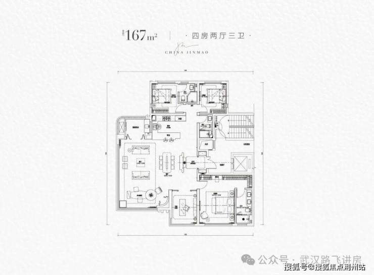 ③167㎡户型:四房两厅三卫,得房率达到102.5%。整体采用四叶草户型布局,搭配三开间朝南设计,很适合当下二孩家庭居住,父母、夫妻和两个孩子可以各住一间房,休息时不会互相打扰,每个人都能有自己的独立空间。该户型设有独梯入户,作为汉阳首个生活功能环幕舱,配有12米巨幕落地取景窗,采光和视野效果很好。客餐一体的洄游公区面积超过60㎡,活动空间宽敞舒适。在内部公区打造上,项目规划了 “一环两带十景” 的景观布局和 “四大空间” 的功能分区,能提升整体居住体验。
