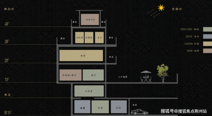 从纵向体验来说,算上地下室夹层,上下共五层半,独立分区,居住空间和生活空间的尺度,都远超市场上同类产品的层高,更是秒杀普通的平层叠墅。