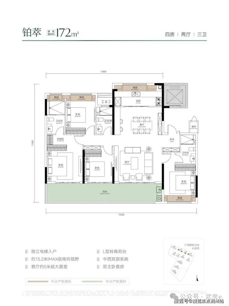梯户比:1T2户(3个单元),得房率:95%
