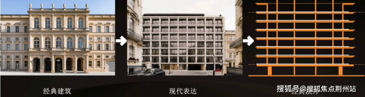 建筑立面设计汲取古典三段式构图精髓,通过横向水平线条的连续性与竖向柱列的支撑,形成建筑的基本韵律和节奏。顶部的开放式飘板设计赋予建筑轻盈的轮廓,单体建筑的比例在群体关系中得到进一步强化,建筑的进退与高度的轻微起伏,带来了群体关系上的灵动感受。面向城市的落地窗和转角飘窗消解了建筑的体量,将景观引入居住内部空间。