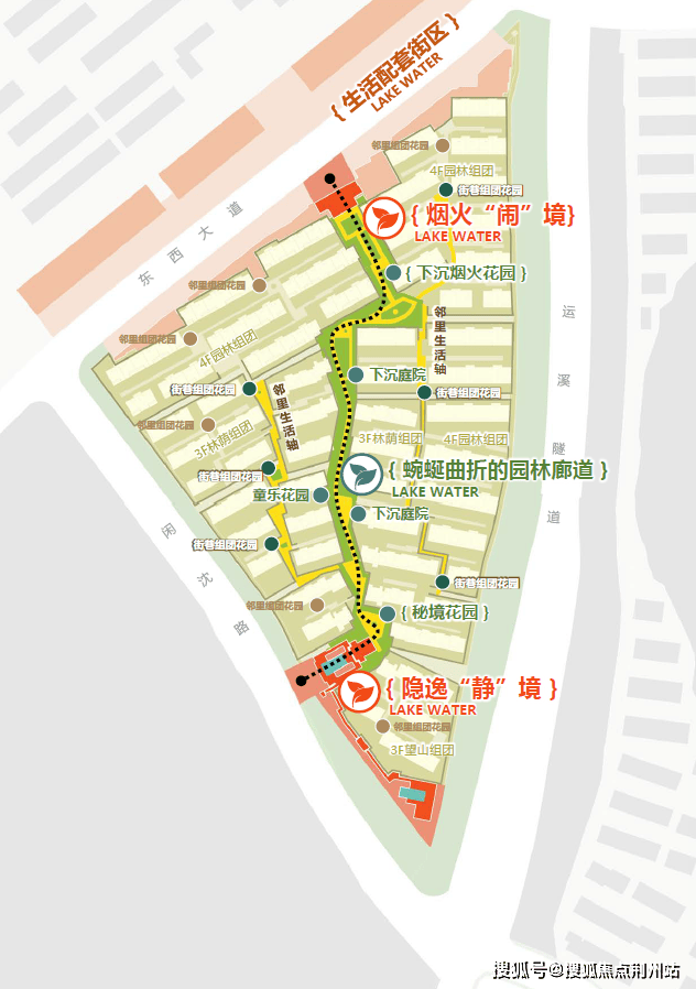 该地块在概念层面,以东西文化中相同的“永恒”概念串联南北地块,从西方的文化象征与审美结晶中寻找美学的永恒,从西湖的山水意境中寻找人文图景的永恒。将经典图景融入项目,形成由时序胜境、雅典卫城、不朽艺廊、枫丹台庭、恒晖水境、印象芳庭组成的法式地中海美学“恒韵六境”和翠幕云垣、云泊映恒、恒庭境、映天阙、映月长漪、渡月虹坞组成的“溪山恒境”,通过蜿蜒水轴串联交融出南北两种不同风格的景观,达成不同的景观情境,和谐的景观感受,展现两种气质不同却又和谐共生的居住体验。