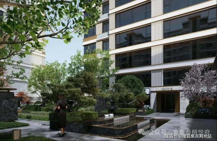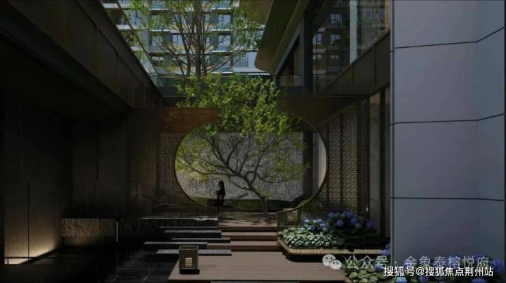 “绿荫漫卷花间影,悦庭闲步静心舒。”单元入户前点缀精致灯具与楼号,铺装调色设计大气优雅,树下绣球满簇,营造出尊贵舒适的入户空间。
