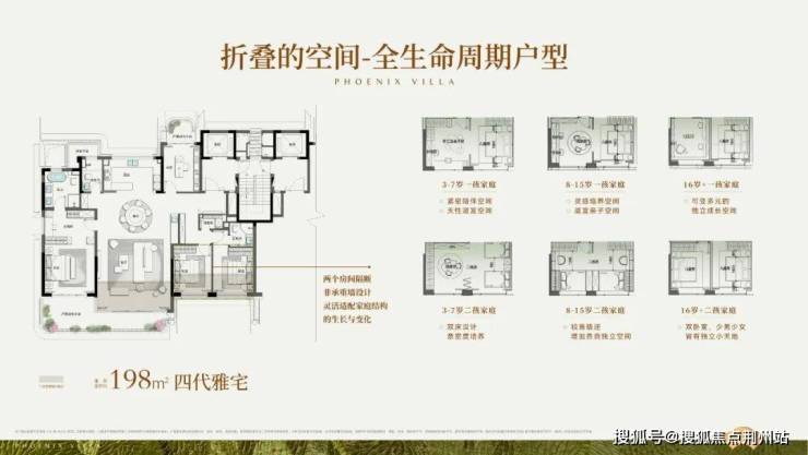 绿城·凤栖云庐用「全生命周期户型」打破了这种困局:一般家庭会经历新婚、育儿、二孩到分巢等几次家庭结构的变化,居住需求也要随之变化,而居住空间的固化,限制了居住者在不同阶段的需求匹配。因此绿城理解的四代宅是一个能陪伴家人成长的家。