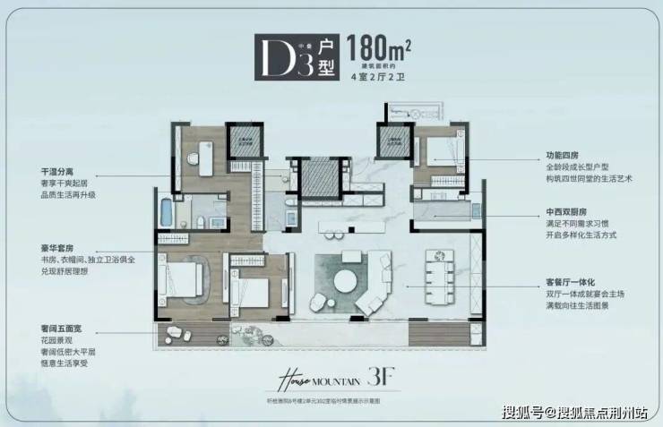 建面约180方中叠则打通整层五个南向开间,实现墅居大平层的奢阔体验,约18米的大尺度跑道式观景台,可以轻松来场室内高尔夫。