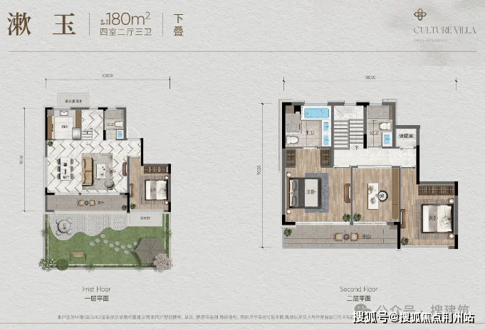 下叠建面约180㎡户型,首层带私享院子,三开间设计,南向整体面宽约10.8米,餐客厅一体,下叠的一楼客餐厅直通约50-60㎡南向庭院,二层主卧空间搭配足有7.2米长的连廊阳台,形成“主卧—书房—连廊阳台”的格局,即使起居在二层,也能与自然形成良好的互动。
