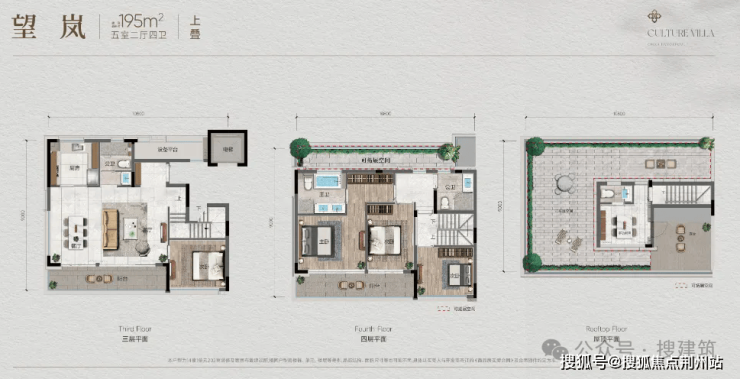 上叠建面约195㎡的五房四卫,同样三开间朝南,三层一体化的空间设计,四层休憩区拥有南阳台+北露台,顶层空中阁楼除了多功能空间外,还有“270°环幕式”生活露台,面积有70㎡左右,与自然气息无缝衔接。