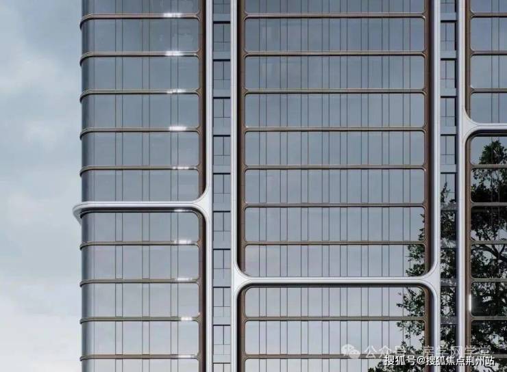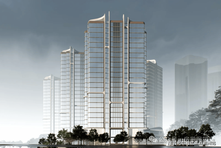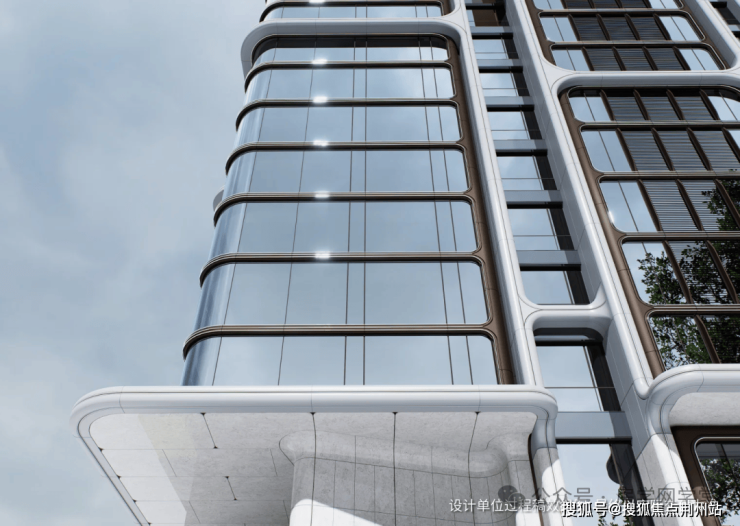 大面积蓝灰色玻璃幕墙为主材,配以深灰色铝板与浅金色型材,形成现代简约的顶级豪宅气质。