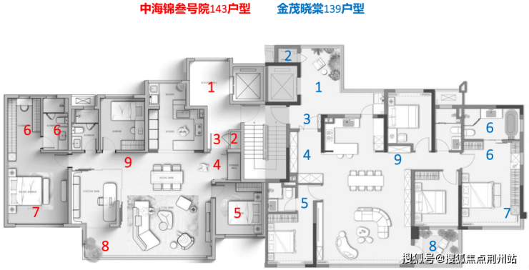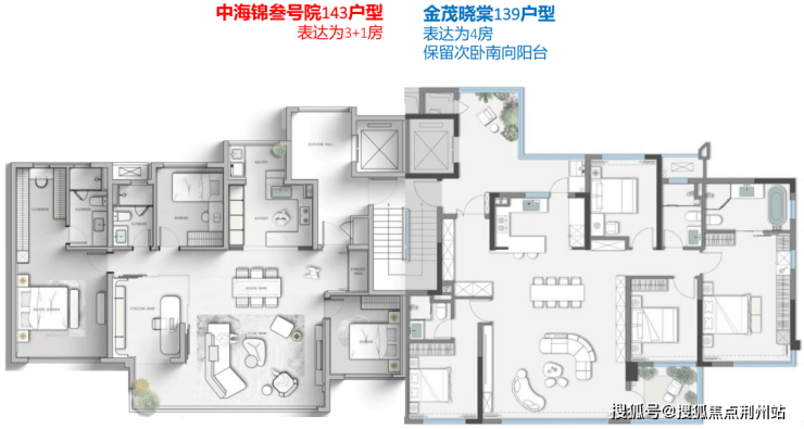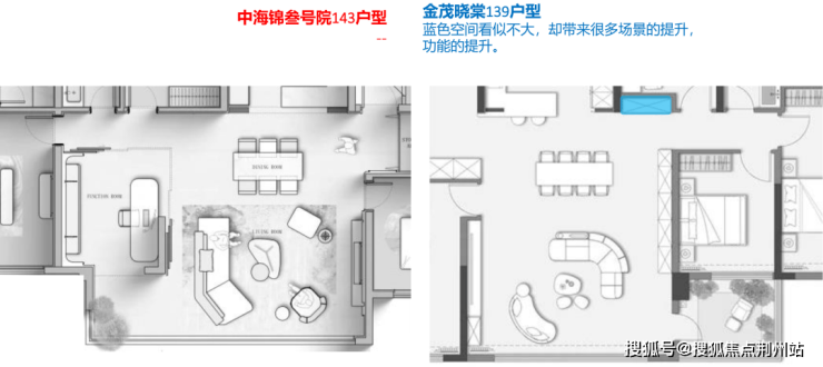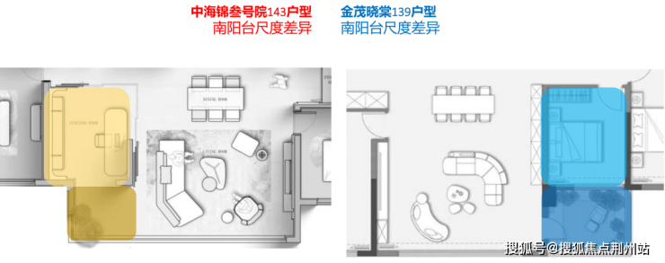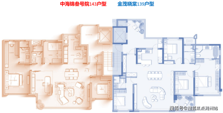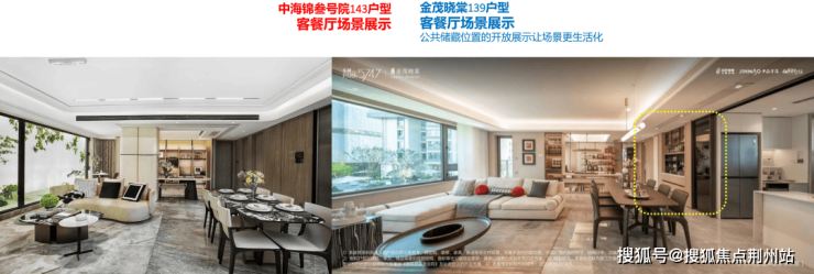 以金茂晓棠139户型与中海锦叁号院143户型做一个对比,就可以看到每一处小空间绣花功力的积累下所带来的整体产品力的差异。