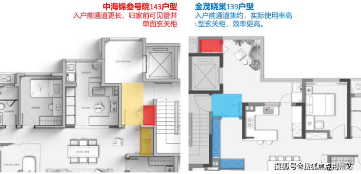 中海锦叁号院143的入户前通道更长,占用的有效使用面积更多;