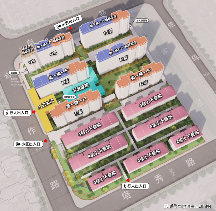 叠墅区域在南侧塔秀路上有单独的人行出入口,与洋房业主可以有不一样的日常动线,两个区域互不打扰,更有别墅的居住体验。