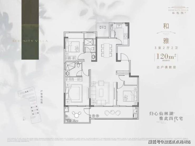 建面约120㎡的三房两厅两卫户型得房率很高,有双联阳台,外加一个露台,南向赠送面积很多,居住舒适性很高。