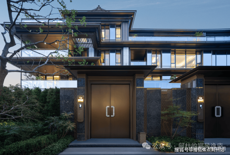 建筑立面采用了石材、大面积玻璃为主要材质;细节之处设计师搭配白色石材和鎏金线条,借鉴蜀山先照寺的重檐叠韵,独创镂空金属格栅,赋予立面吉祥如意,让建筑既是居所,亦是可传世的艺术珍藏。