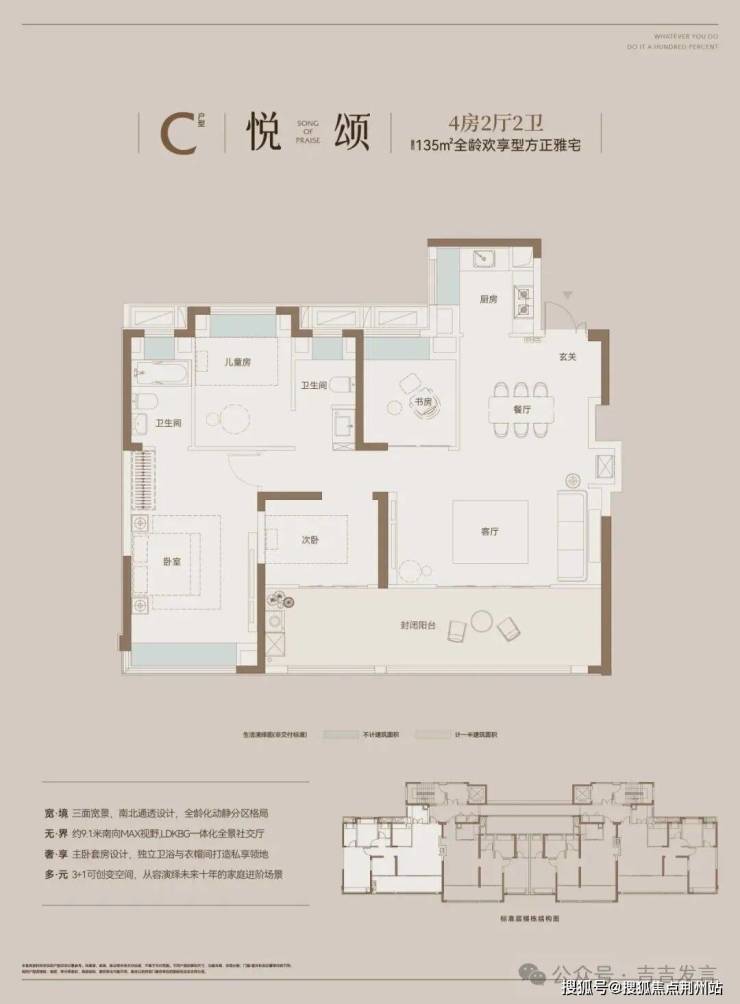 建面约135㎡方正雅宅,3+1创变空间,三面宽景、南北通透,LDKBG一体化聚厅。