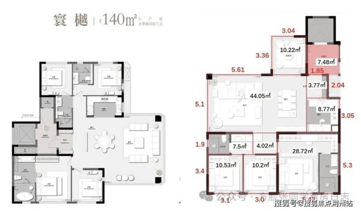 几个关键数据很扎实:客餐厅约44平,厨房约9平,主卧套房约29平,三个次卧也都保持在约10平的水平。