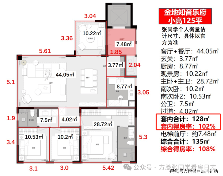 根据我个人估算,它的套内得房率约102%、实际可利用面积能达到128平,相当于之前160平的江景房或湖景房。