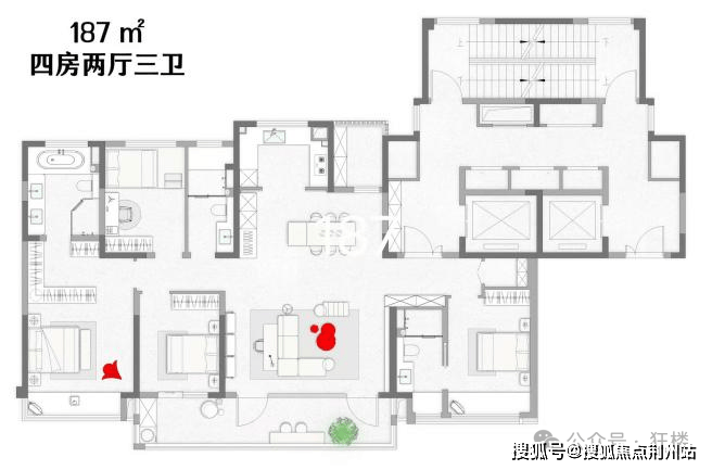 这是狮山金茂府中间档户型,建面约187㎡户型做到了4房2厅3卫,其中3个卫生间均做了明卫。