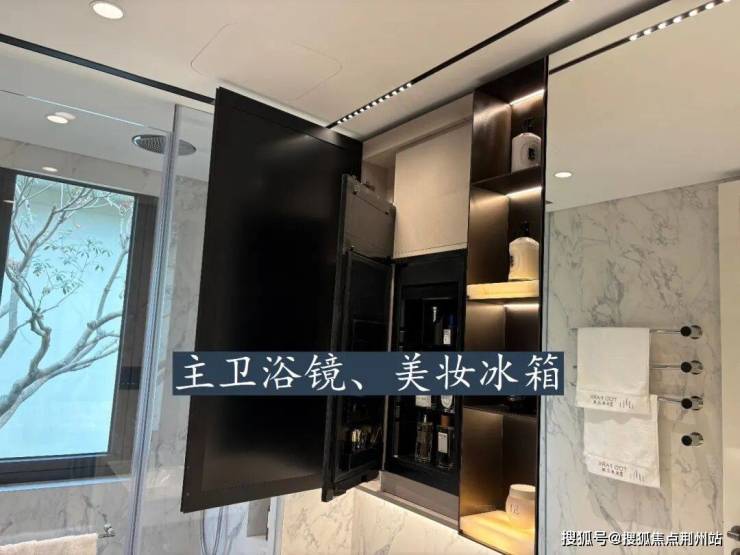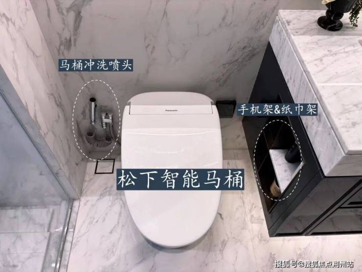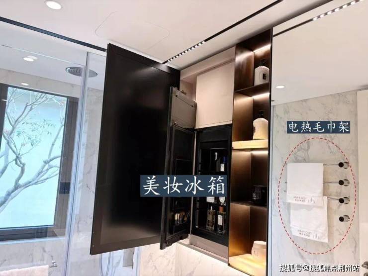配置杜拉维特台盆及镜柜(美妆冰箱)、汉斯格雅恒温花洒内置式顶喷、松下智能马桶冲洗喷头、科勒复古玫瑰金龙头、防止堵塞的地漏阻挡条、电热毛巾架、线性暖风机,真是细节之处见真章!
