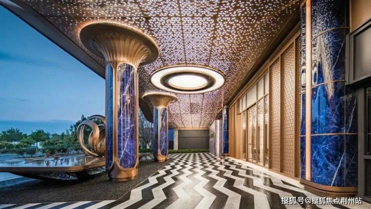 二期组团,则率先呈现了度假酒店式的归家体验。宽约40米的归家门廊,中间被6根廊柱合力撑起。顶部铝板外檐+梦幻星空顶,地面为真石材拼接铺装,立柱采用景泰蓝艺术品级工艺,宛如皇家宴会厅的富丽堂皇。