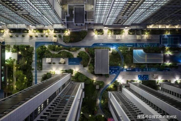 约400米蓝色健康环形跑道十分显眼,如同流淌的河流蜿蜒贯穿于绿植、楼栋之间。(实景图)